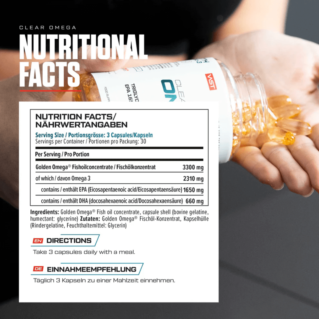 VAST Clear Omega yra vienas labiausiai koncentruotų ir labai stiprių Omega-3 papildų rinkoje. Sukurtas sportininkams ir aktyviems žmonėms, kurie siekia greitesnio atsistatymo, didesnės ištvermės ir maksimalios organizmo funkcijos. Dėl trigliceridų formos ir patentuoto valymo proceso šis labai stiprus Omega-3 įsisavinamas kur kas efektyviau nei įprasti žuvų taukai.